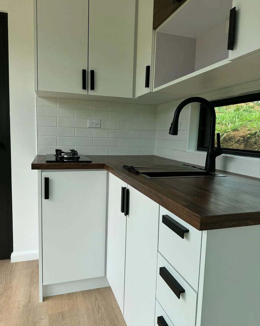 L’interno propone un’eleganza funzionale: bagno completo con rivestimento in piastrelle nella zona doccia, doccia flessibile retrattile, lavabo con mobile in PVC e sanitari moderni. La cucina a forma di “L”, dotata di mobili in PVC, combinata con pavimento vinilico premium, armadio con ante a specchio, illuminazione LED incassata nel soffitto e climatizzazione con 2 unità inverter da 12.000 BTU, crea un ambiente abitabile efficiente, confortevole e accogliente.
